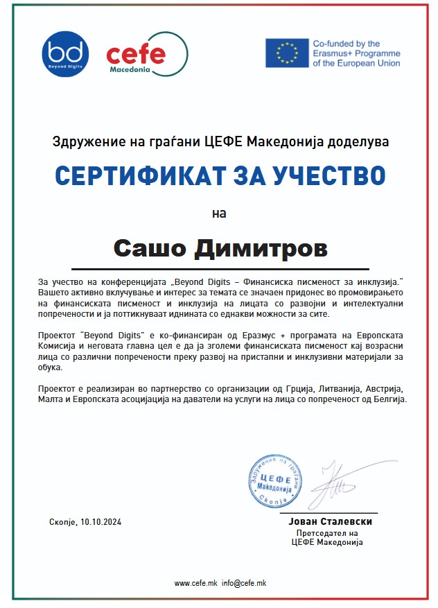 The “Beyond Digits” project is co-funded by the Erasmus+ program of the European Commission. Its main goal is to enhance financial literacy among adults with various disabilities by developing accessible and inclusive training materials.